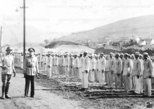 O Marechal Waldemar Brito de Aquino, então Coronel e diretor da FPV, passa por operários em evento de comemoração do aniversário da Fábrica, em 15 de março de 1944.