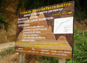 Seu João Corrêa, que atua como guia para idas ao Pico dos Marins, e uma das placas criadas pelo Projeto para sinalização da Trilha dos Marins.