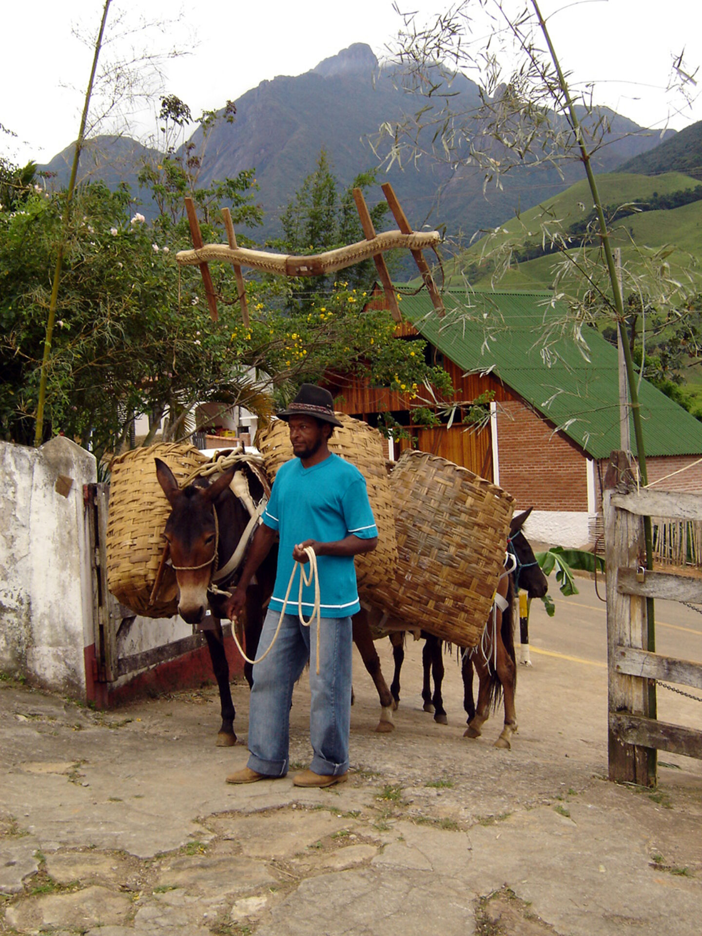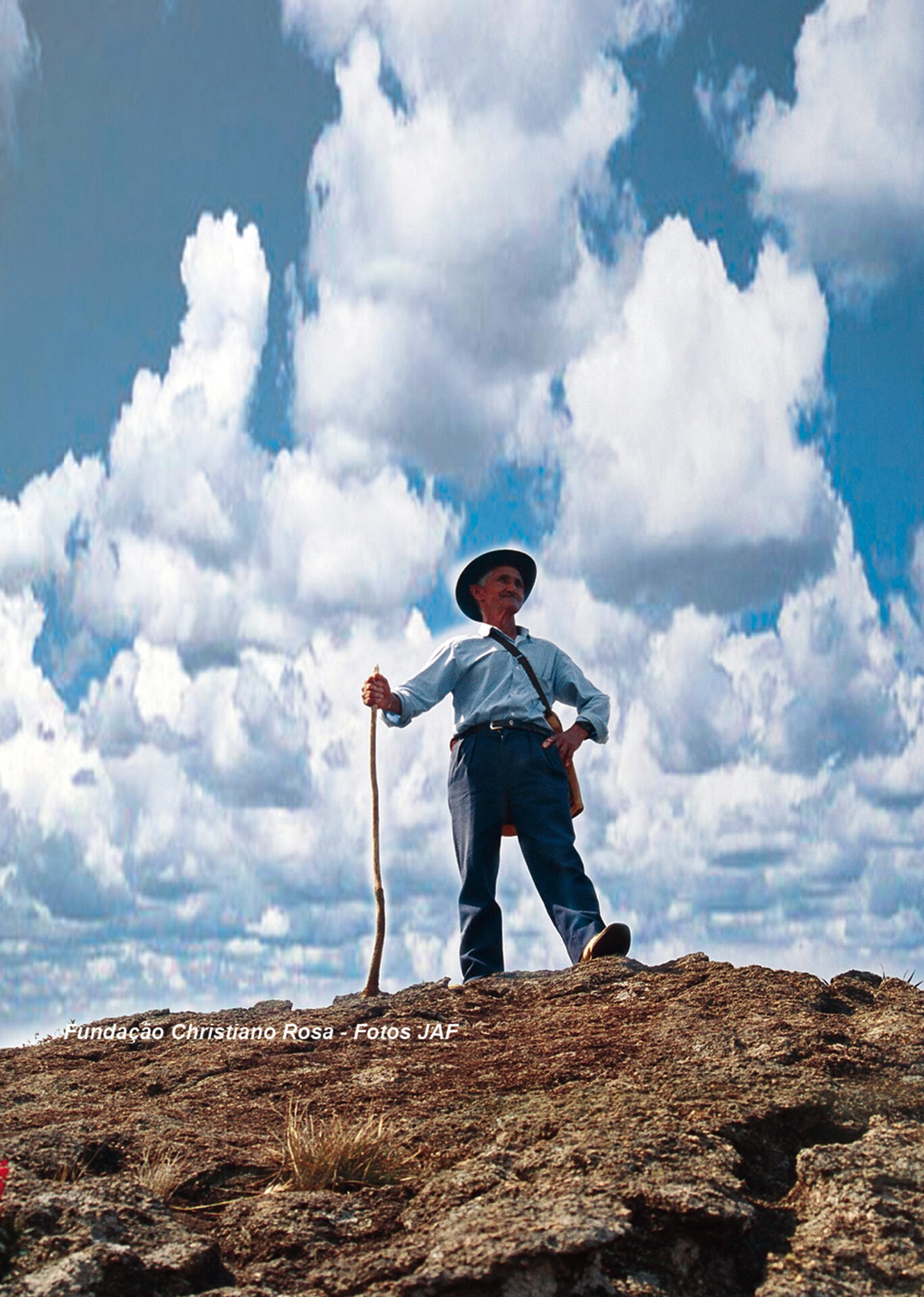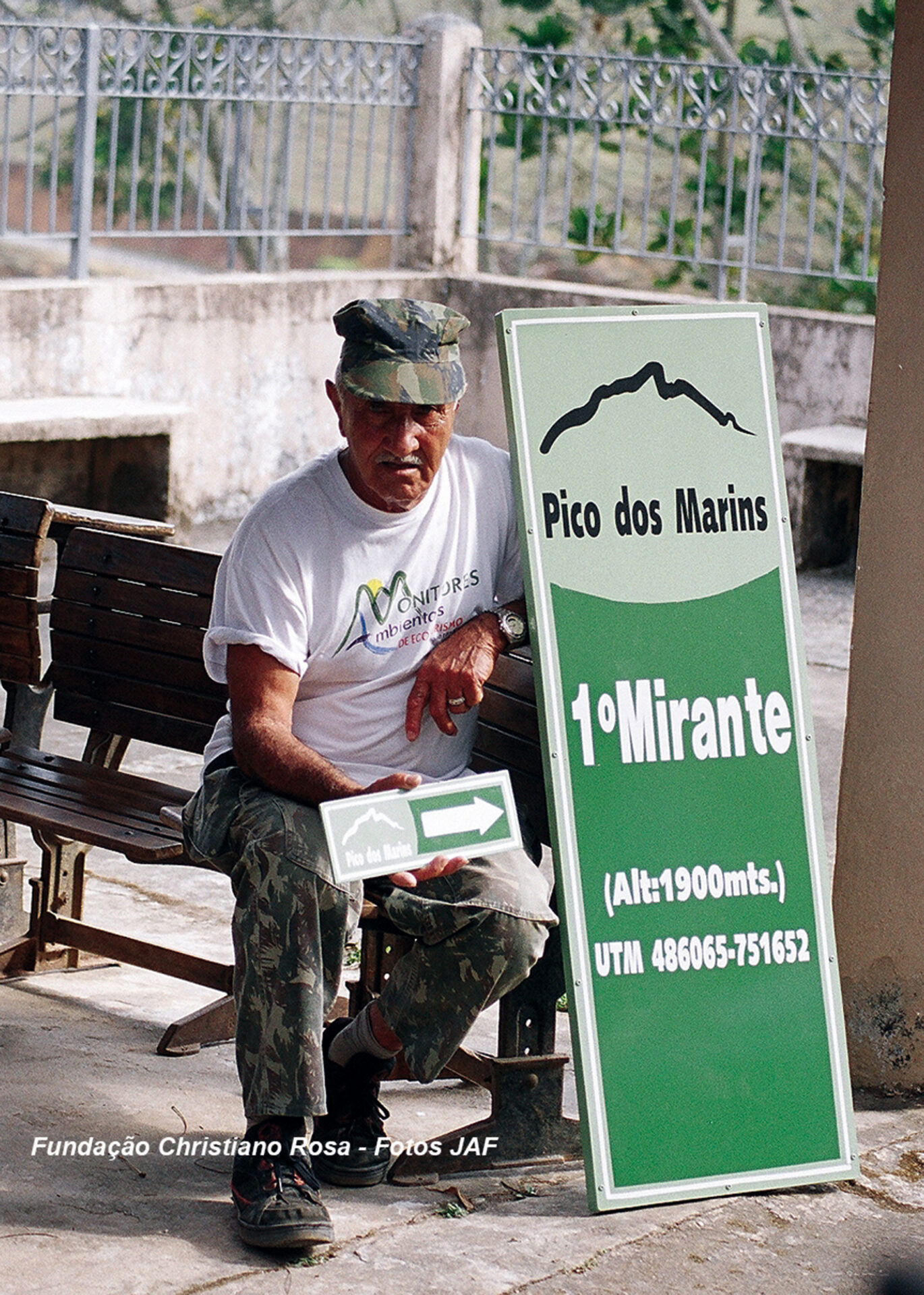 Seu João Corrêa, que atua como guia para idas ao Pico dos Marins, e uma das placas criadas pelo Projeto para sinalização da Trilha dos Marins.