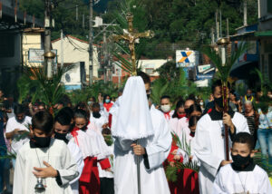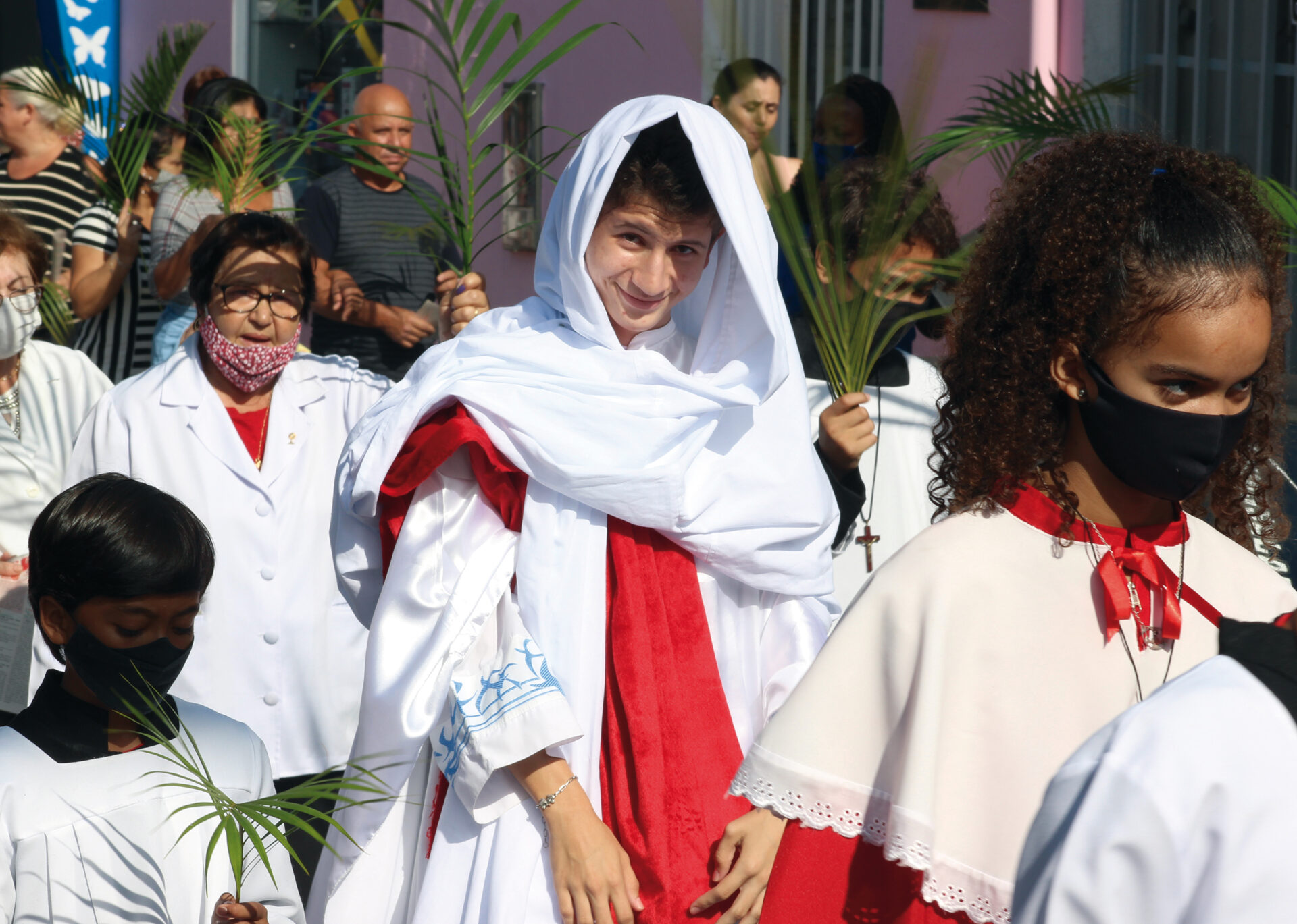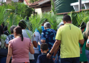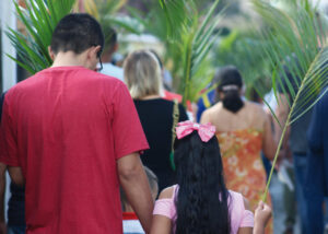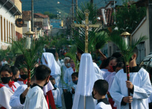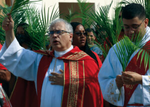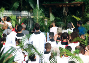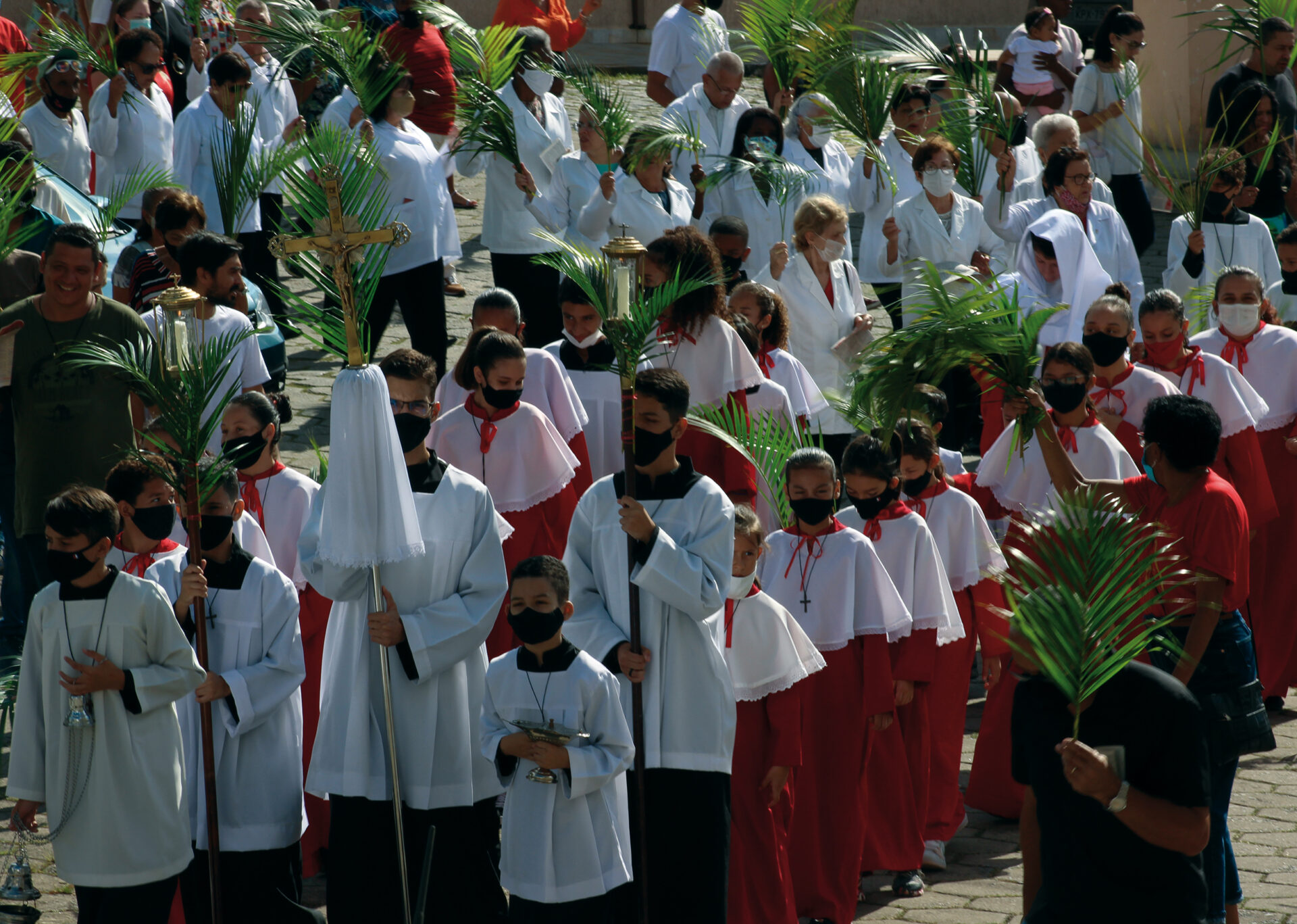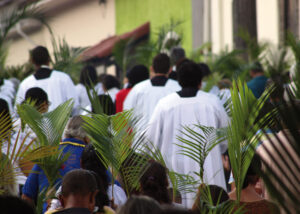 Domingo de Ramos, dia em que se comemora a entrada triunfante de Jesus em Jerusalém. A igreja repleta de fiéis, pela manhã. O oficiante ordena que todos se retirem para que se possa organizar a Procissão de Ramos. O coro canta os hinos próprios: “Glória, laus, et honor, tibi sit Rex Christe Redémptor”: “Glória e honra ao Cristo Rei Clemente. Glória a Ti, filho de Davi”.