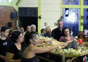 Jovanir Santos (com a representação do Sudário nas mãos) como Verônica. Foto de 14/04/2017, durante a Semana Santa em Piquete, SP.