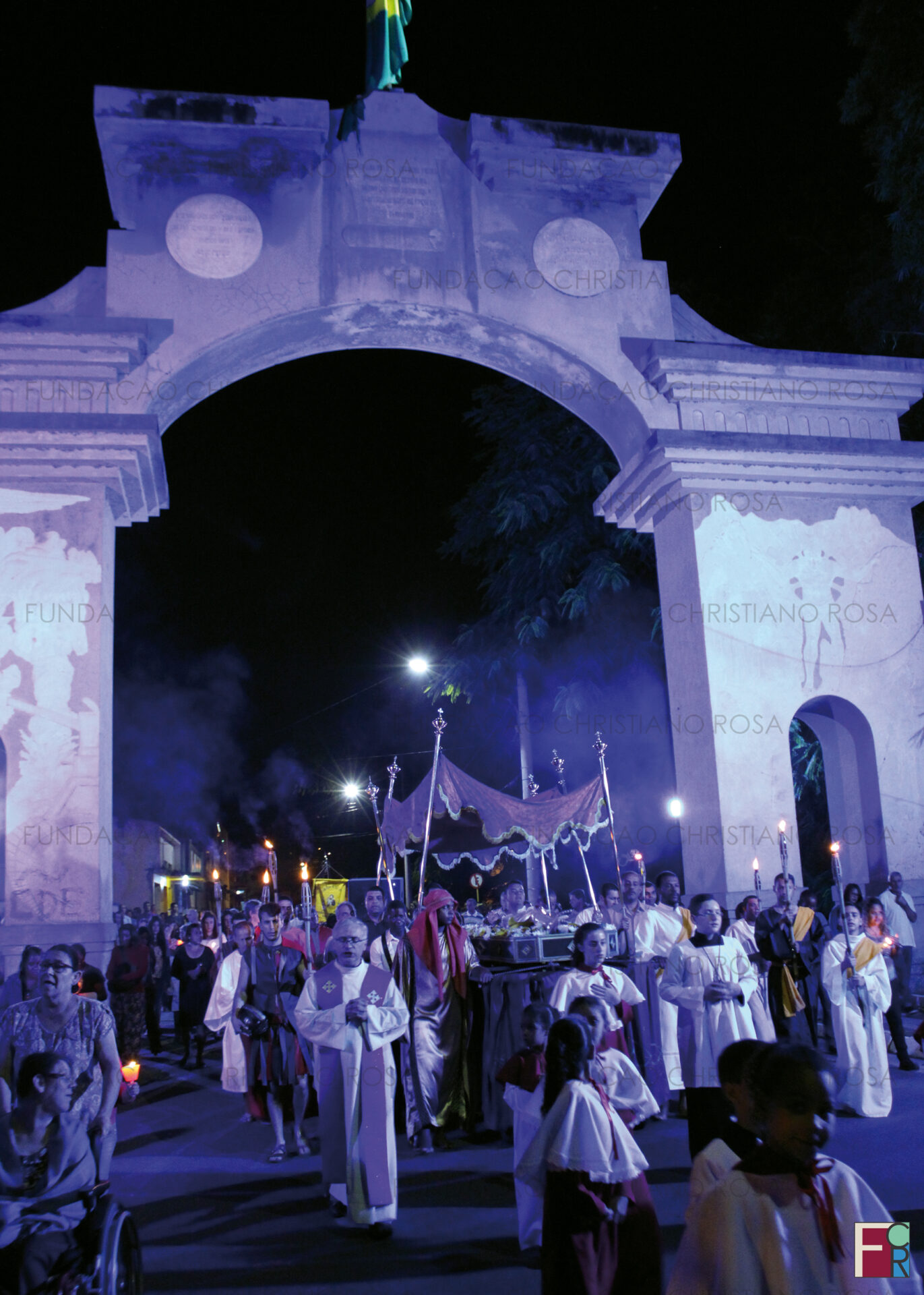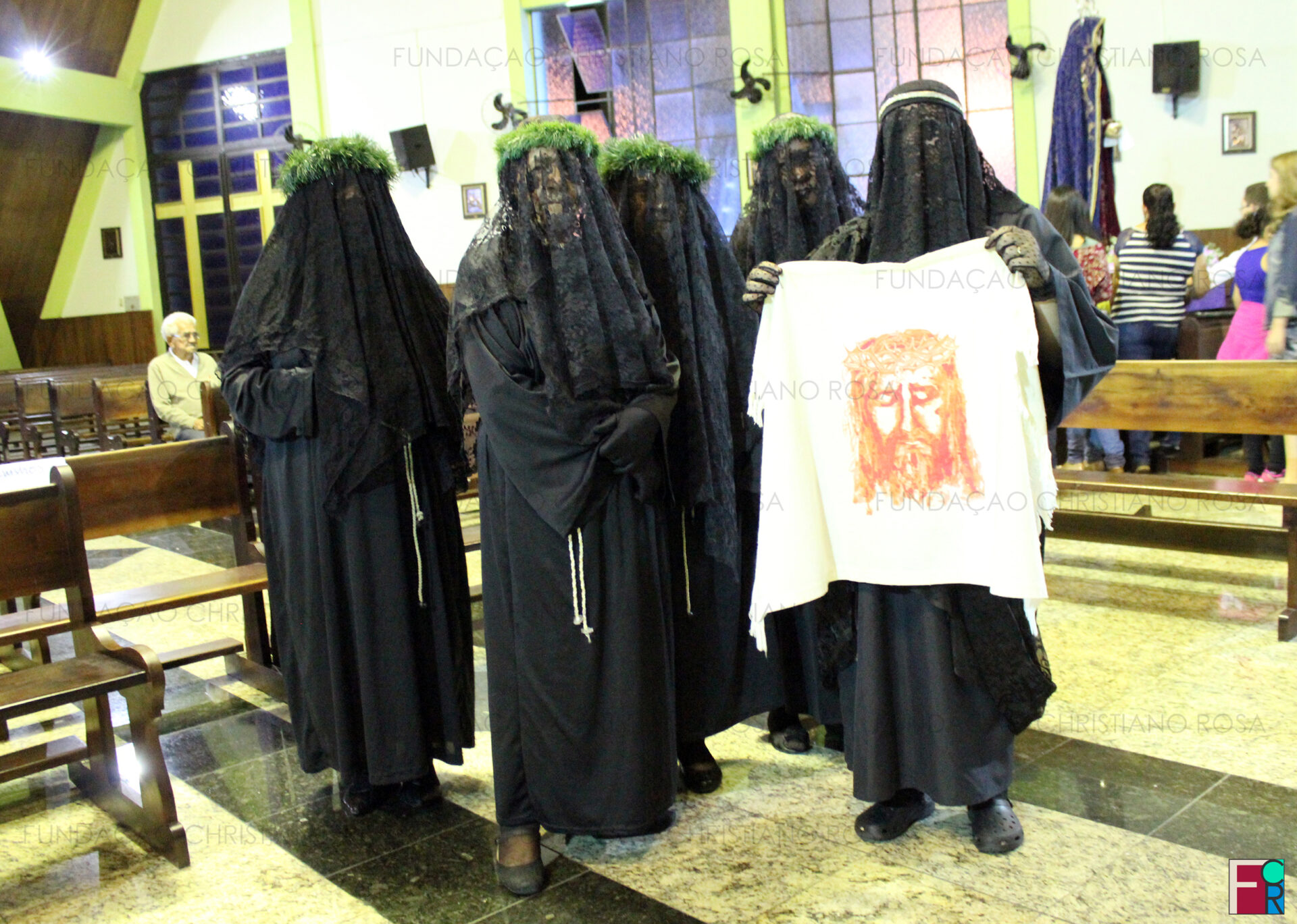 Sexta-feira Santa: a matraca assinala a saída da procissão, na frente um crucifixo ladeado de luminárias e castiçais, logo atrás uma grande massa de fiéis, um esquife todo ornamentado com a imagem do Senhor morto. Sobre o esquife, um dossel roxo. Assim que o esquife do Senhor chega à rua, à porta da matriz aparecem quatro vultos de preto, todas com véu e três coroadas de espinhos. A quarta mulher sobe em uma banqueta e começa um canto triste desenrolando um pedaço de pano onde está estampado o rosto de Jesus. Findo o canto, a procissão inicia seu cortejo. Em alguns pontos a mulher de preto volta a cantar, tendo por coro os vultos coroados de espinhos, e por fim, antes que a imagem entre na igreja, faz sua última apresentação e se recolhe; é a Verônica que, acompanhada das Marias Beus, desaparece no interior da igreja.