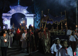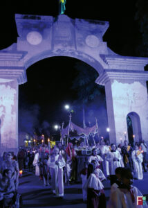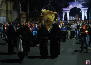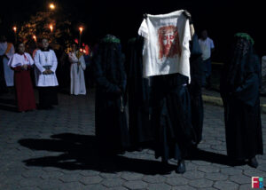 Jovanir Santos (com a representação do Sudário nas mãos) como Verônica durante a Procissão do Senhor Morto. Foto de 14/04/2017, durante a Semana Santa em Piquete, SP.