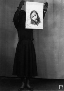 Maria Beraldo Castanho como Verônica em 1957. O sudário foi pintado pelo artista Otávio Cândido. Foto de Dogmar Brasilino.