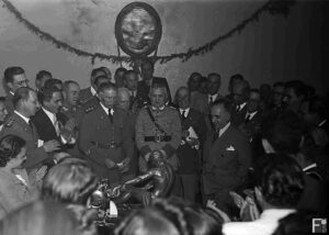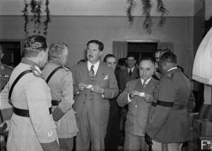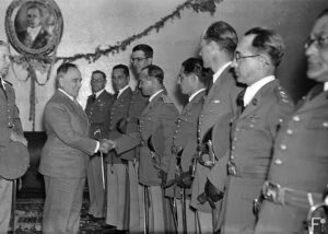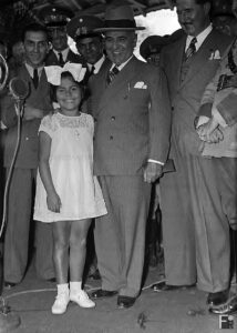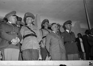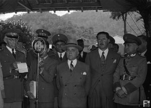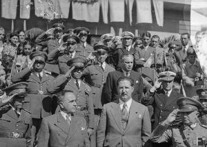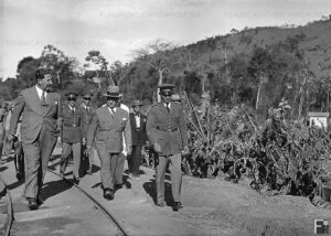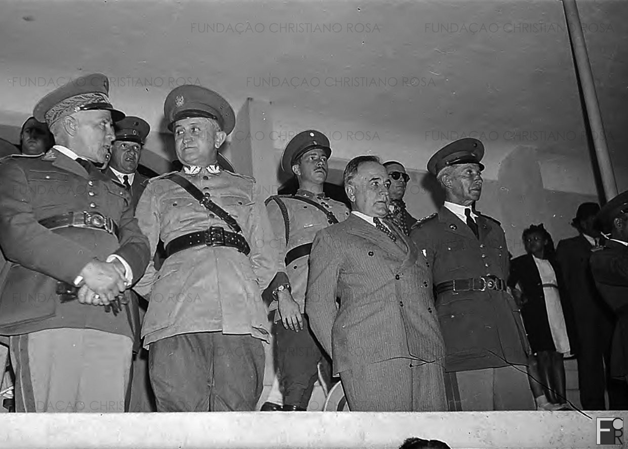 O então Presidente da República, Getúlio Vargas, acompanhado do Governador de São Paulo, Adhemar de Barros, e do Ministro da Guerra, Gen. Div. Eurico Gaspar Dutra.