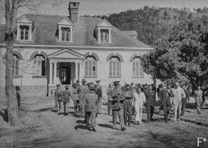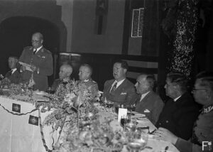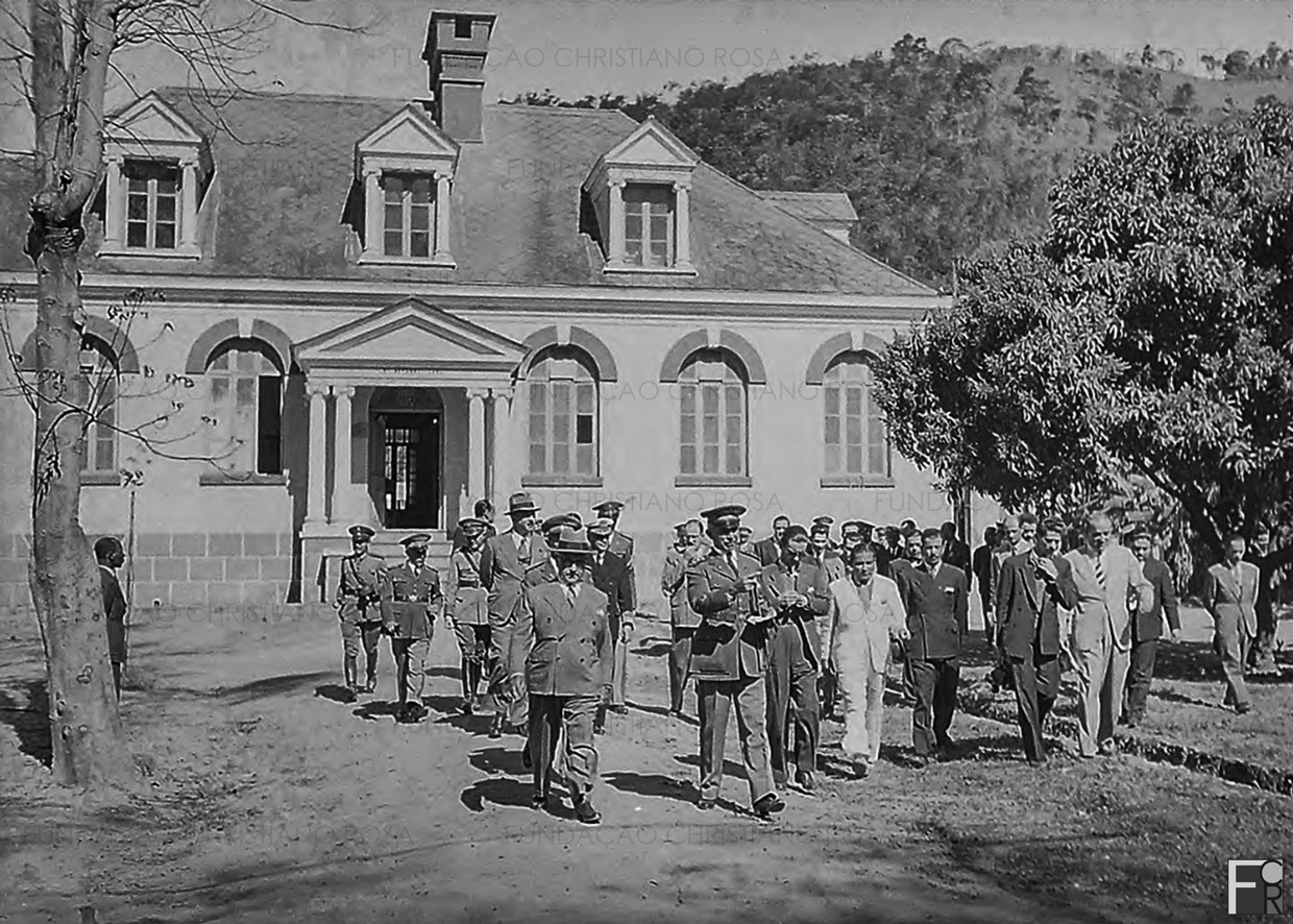 Mais tarde, todos se dirigiram para o jardim em frente à administração, no interior da Fábrica, onde o presidente foi saudado pelo Coronel Gomes Carneiro que, em nome da diretoria, da administração e da oficialidade deu as boas-vindas ao insigne visitante.